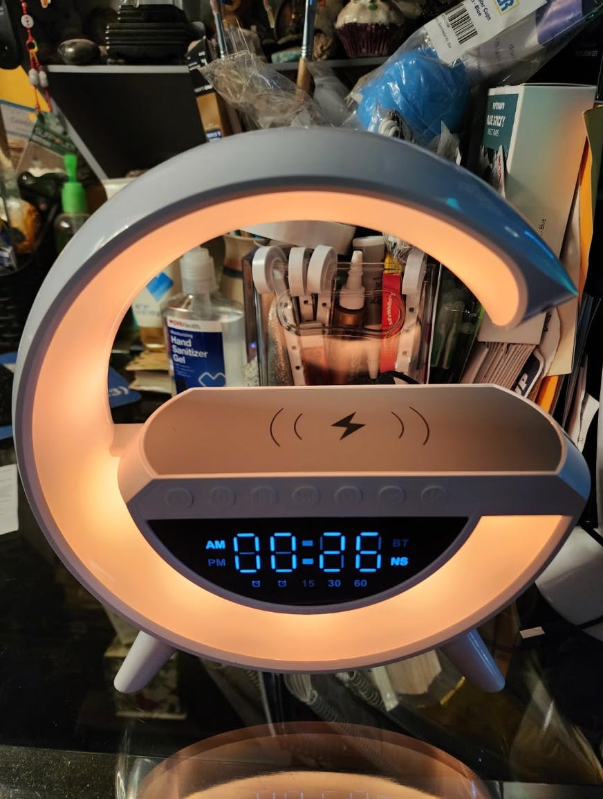 Our LED Smart G-Shaped Wireless Charging Lamp is a stylish all-in-one gadget that combines a 15W fast wireless charger, Bluetooth speaker, digital clock, alarm, and 13 dynamic lighting effects. Perfect for your bedroom, study, or office — it brings sound, light, and charging convenience together in one modern design.
